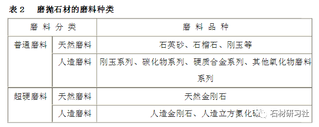 (2)磨具 翻新用磨具有用有机结合剂的树脂翻新片、水磨片,其磨料为金钢石;采用无机结合剂的苦菱土磨块,其磨料为苦菱土,磨抛工具中的磨料金钢石是自然界里的矿物质已知最硬的,莫氏硬度为10º,密度3.15g/㎝3。成分为碳,原生矿于金伯利岩中。根据粒度的大小又分为宝石级和工业级。宝石级主要用作首饰或单颗粒切割材料,又称为钻石级;粒小的则作为工业级,由于其硬度最高,人们利用其硬度来加工其他材料,如切割硬脆材料、作金属和化纤的拉丝模、电子领域的集成电路散热片、高温半导体材料等,其中用于石材加工最多,约占金刚石生产总量的70%,主要用于对石材的切、铣、钻、磨的工具上,在人造金刚石尚未工业化生产时,人们曾大量使用其他非金属、金属材料来作为工具加工石材,如碳化硅、氧化铝、苦菱土等,但效率低,自从工业化大规模生产金刚石和立方氮化硼后,尤其将其用在石材加工领域,使石材生产效率成部提高。