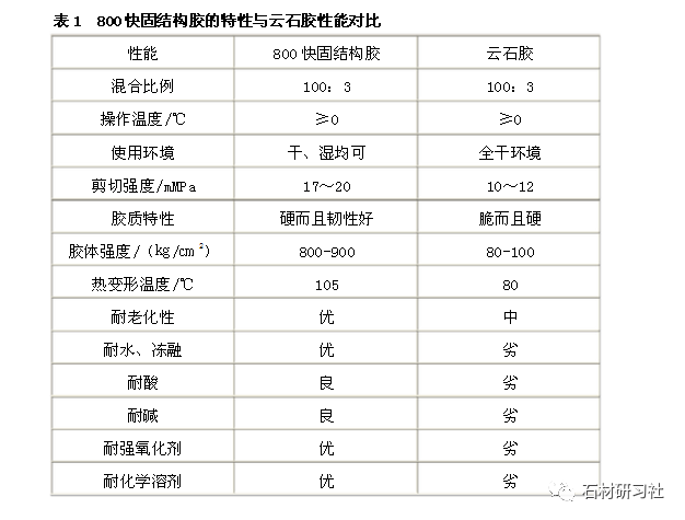 市场上还有一种800快固结构胶,它是以双酚A环氧树脂和不饱和化合物为主体树脂,集中了环氧树脂和不饱和化合物的双重优点,既有云石胶的快速固化、打磨亮度高的特点;又有干挂胶的粘接强度高、耐候性好,耐化学品的特点。