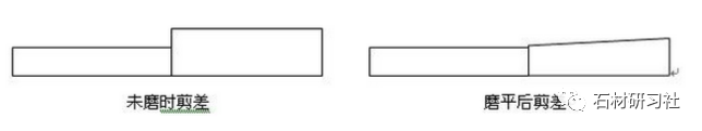 (4)剪口整平 石材的粗贴时,因板材的变形,水泥的收缩,施工人员的失误,造成的板材之间的高低不平,称之为“剪口”,剪差小,用磨机磨高处可直接磨平,剪差大时,可用角磨机去除高的部分,再用磨机整平。剪口如图3: