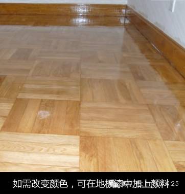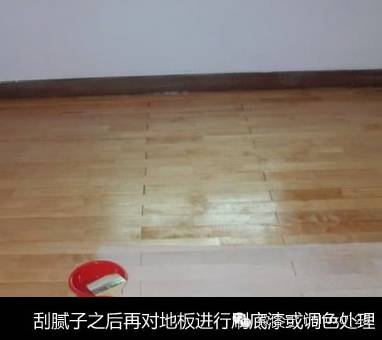 刮腻子之后再对地板进行刷底漆或调色处理。由于实木表层的纹理都是天然的,无法改变花色,只能调节地板颜色的深浅。