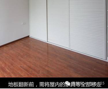 地板翻新前,需将屋内的家具等全部移走,一方面保证家具不沾上灰尘等,另一方面方便地板翻新操作。