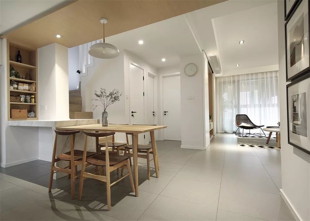 在玄关的侧面就是餐厅空间,原木风的餐桌椅和大理石的吧台结合在一起,在餐厅的侧面还做了一部分的壁龛收纳设计,满足餐厅的储物需求。