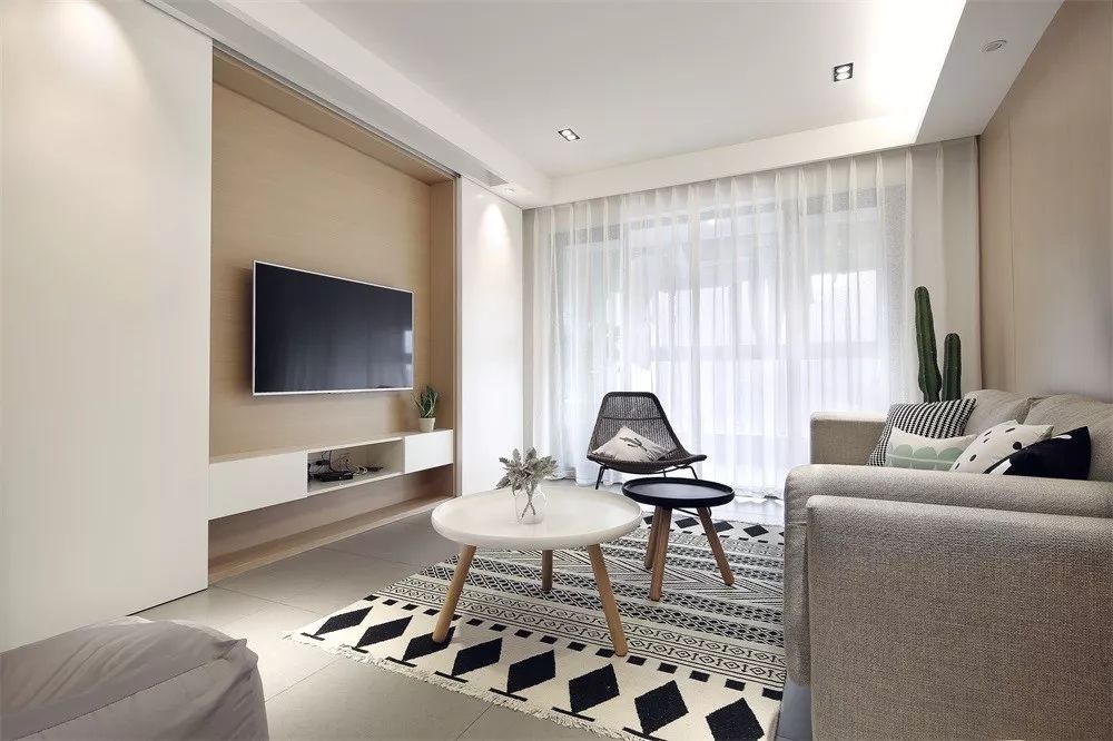 客厅电视背景墙做了做了嵌入式的木饰面板作为装饰,和白色的墙面结合起来,温馨而又大方。灰色的地面和软装相互呼应,简单又舒适。