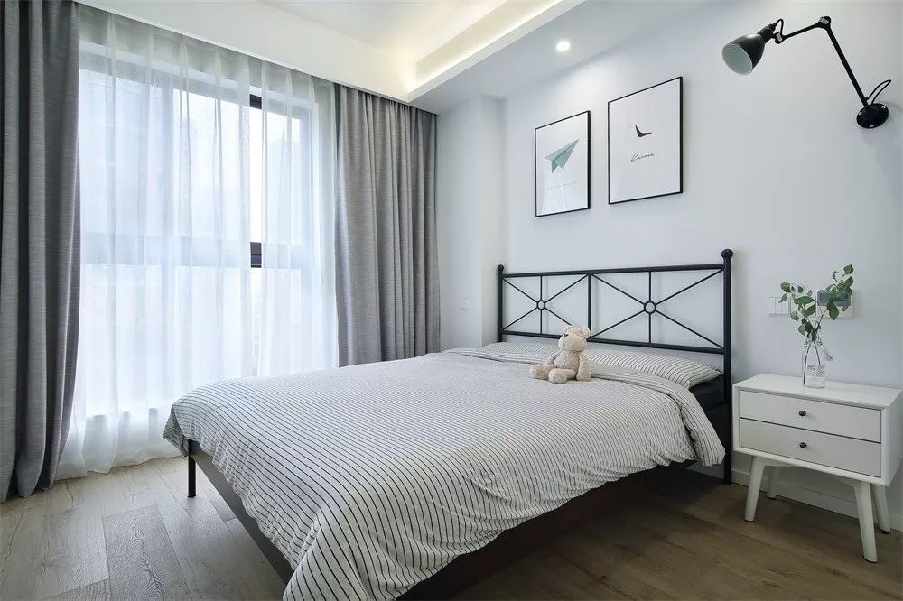 一楼的父母房以白色软装搭配黑白色的床品、灰色的和青色的背景墙,床头柜上还摆放满瓶的干花,让人感觉更加清新雅致。