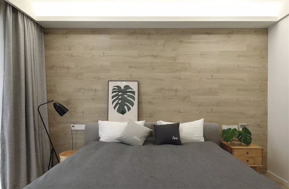 主卧室的床头背景墙铺设了木饰面板,两侧的床头柜也选择了不同的造型,木色搭配灰色的床品和装饰品,整个卧室显得简单而又轻松。