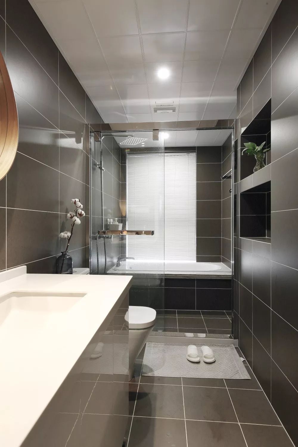 满眼的黑色砖并没有压抑感,搭配白色的卫具,配合入墙的收纳,显得干净大方。淋浴与泡浴的结合,想必也是不少人向往的洗浴空间吧。