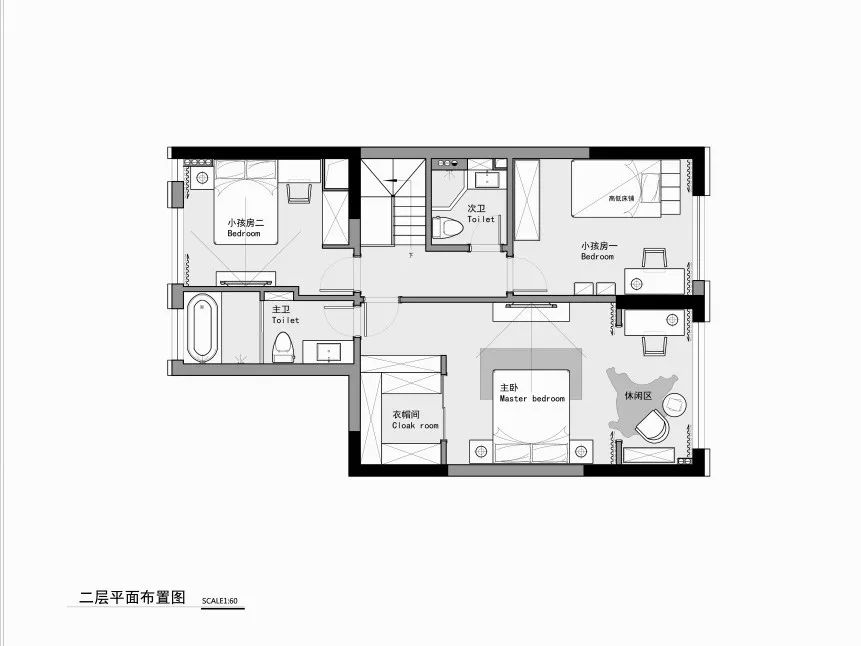 二楼的儿童房是以蓝色作为背景,搭配简洁的挂画、壁灯和铁艺床,顶部吊顶内来做了藏光的设计,在小清新之余,也多出了温馨感。