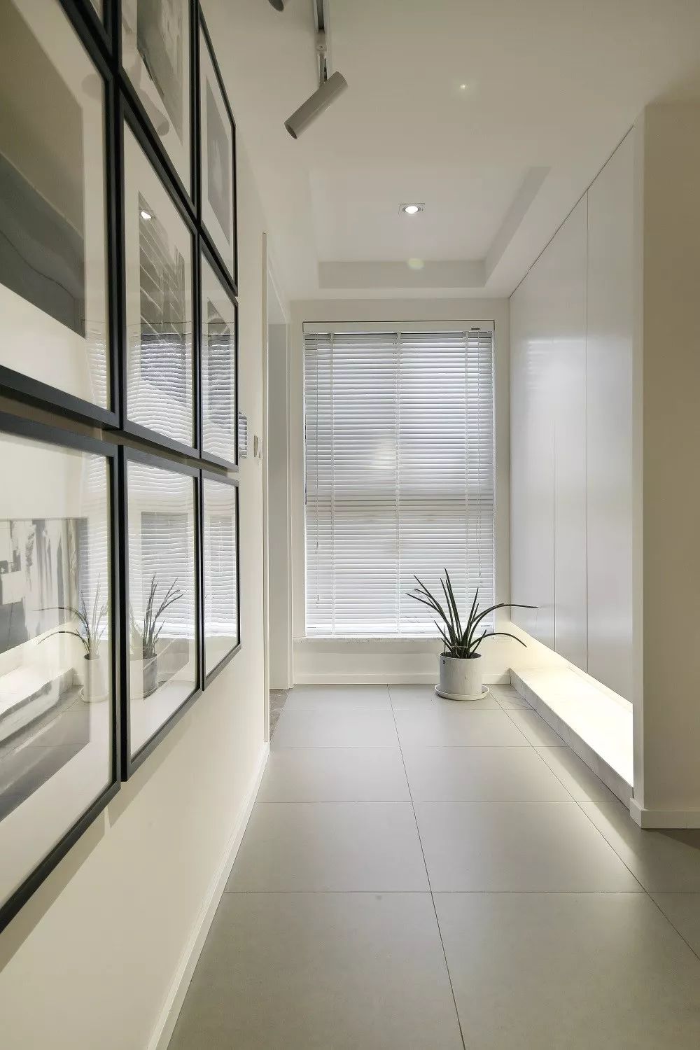 入户门正对着的墙面做了嵌入式的鞋柜设计,鞋柜的底部留空还做了藏光的设计,白色为主的玄关空间搭配黑框的装饰画,非常好看。