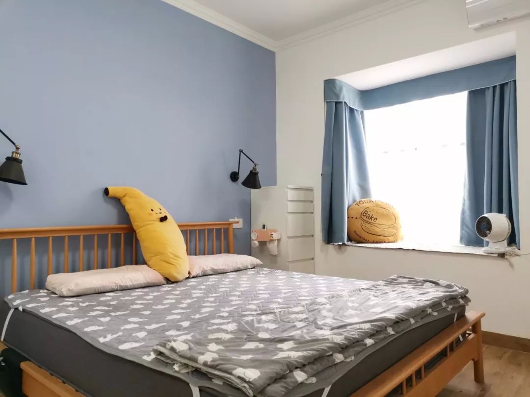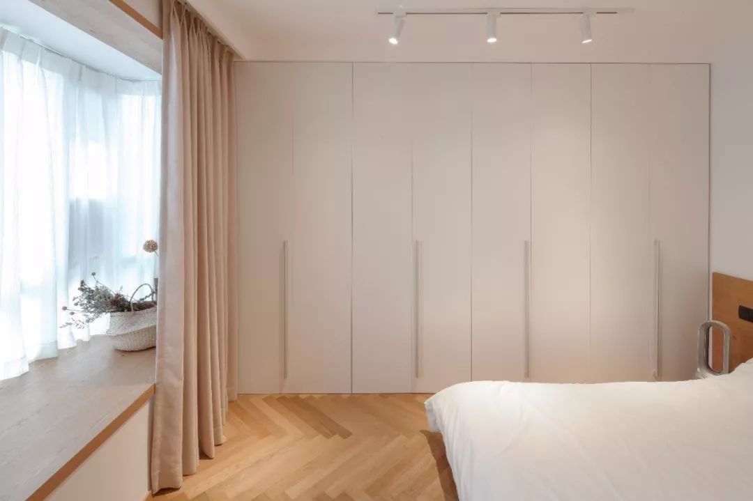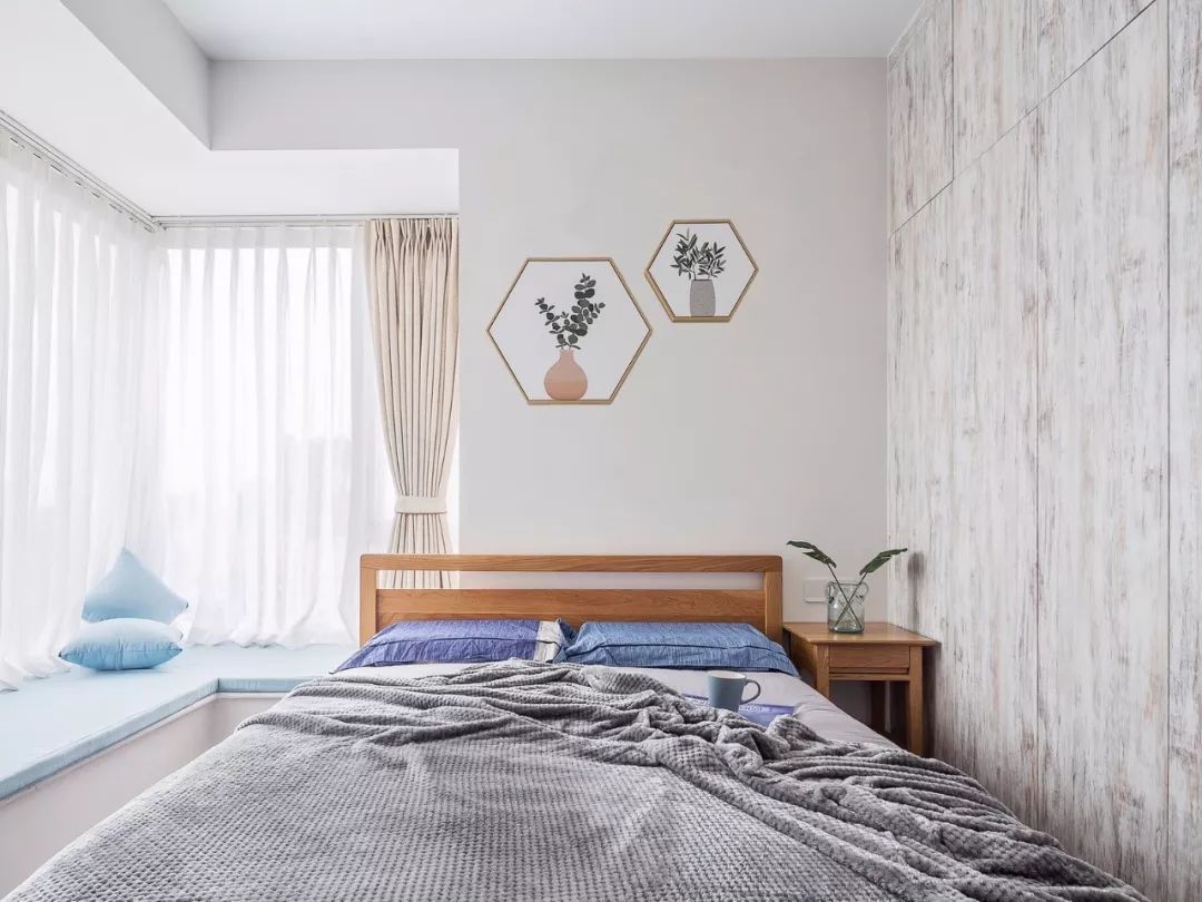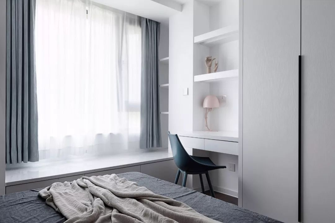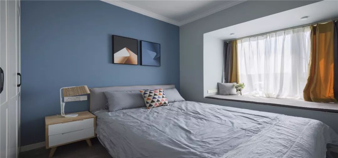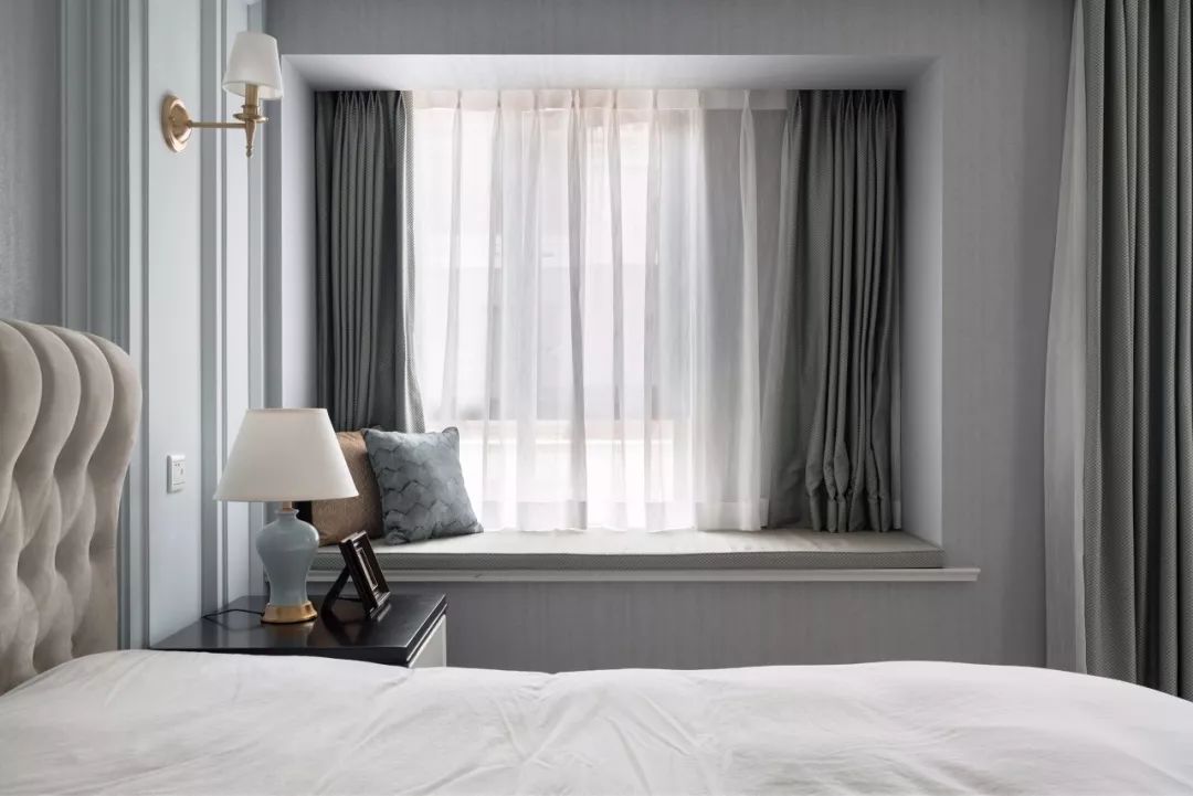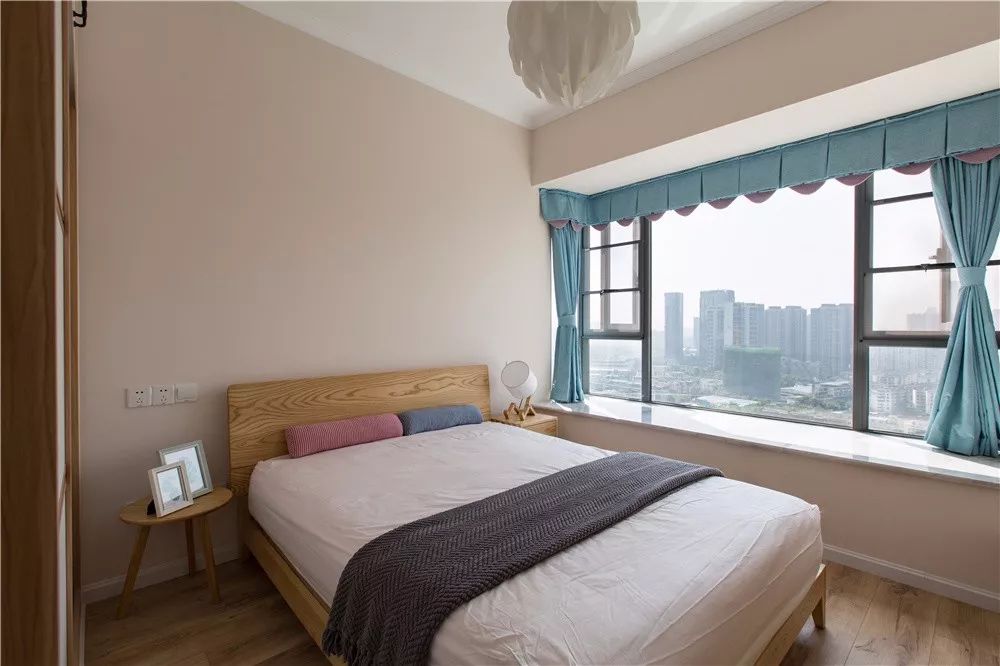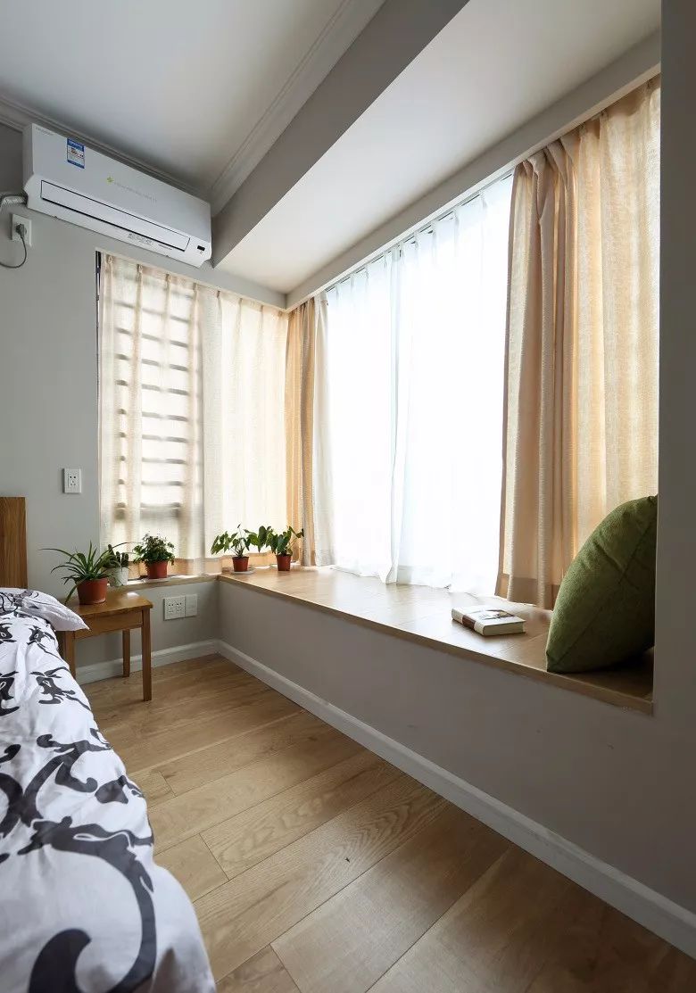 布帘靠墙的话会占用到飘窗窗台以外的空间,如果觉得这样的搭配比较冗余,而且对窗帘侧边漏光不介意,也是可以考虑把窗帘安装在靠窗位置的,这样能保持卧室的简洁感。