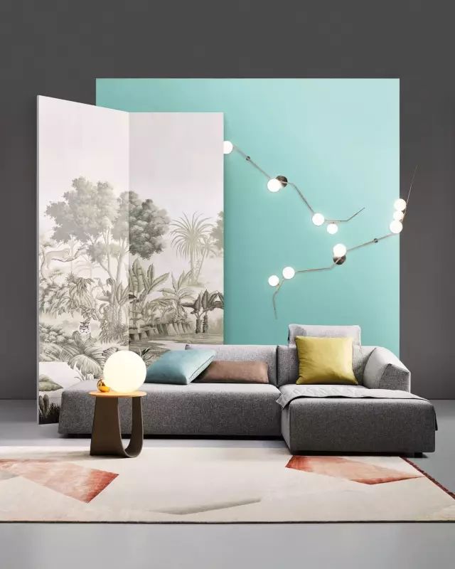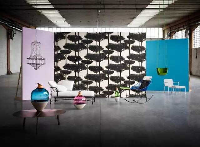 米兰设计周中elitis品牌出彩的屏风设计,绿色植物图案铺满整面空间,繁密而不杂乱。
