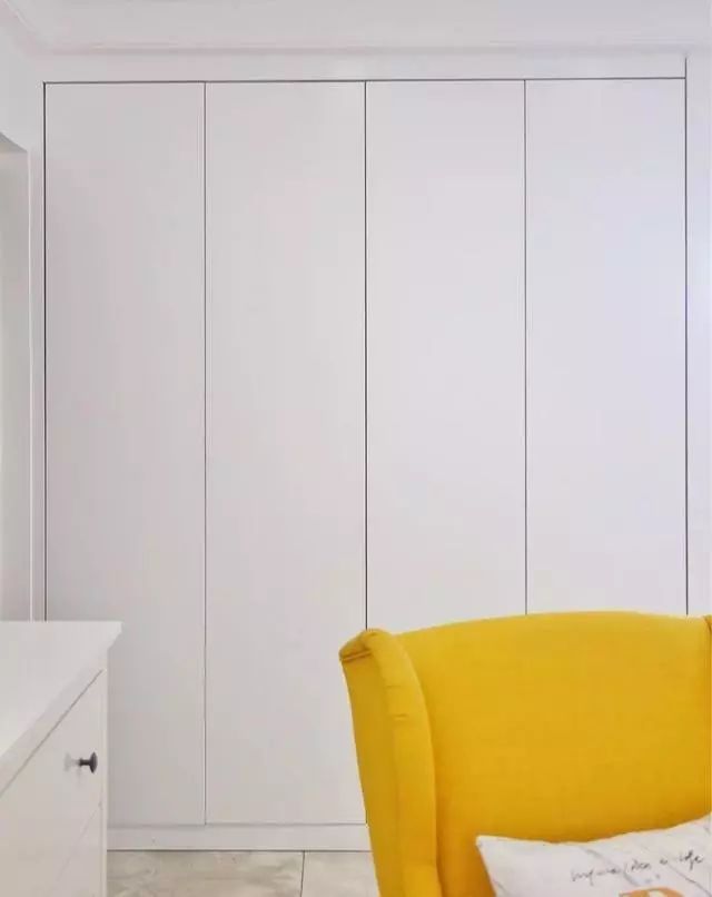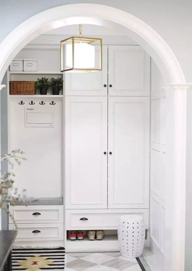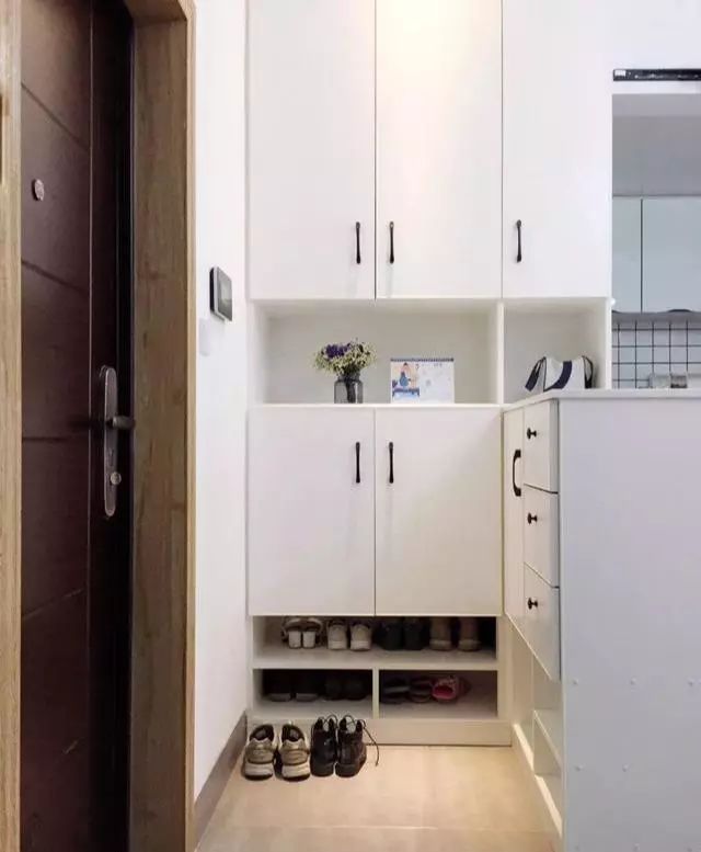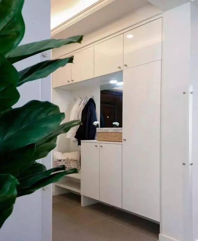 通顶玄关柜入墙设计,减少分割线,按弹式柜门,取消把手设计做减法,加上大白色外观,极力降低玄关柜存在感。