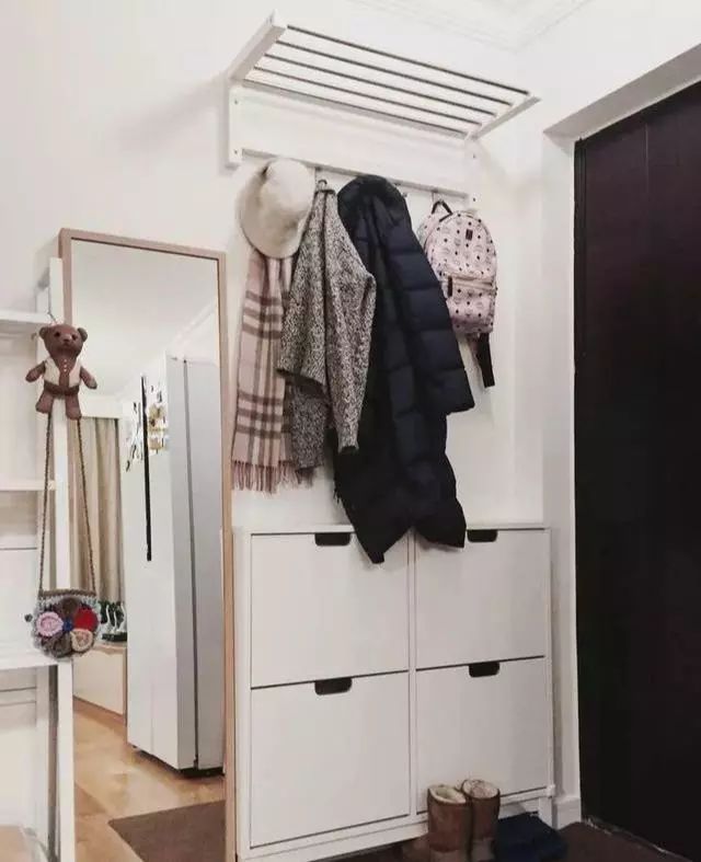 超薄鞋柜贴墙,衣帽架、全身镜也全套宜家配置。
