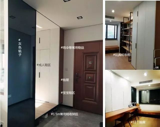 原始入墙玄关柜太满,走廊3步走完,已经没多余空间停车,为了方便玄关随时切换车库模式。通顶鞋柜解体为吊柜+地柜,正好利用中层凹槽位,超机智利用几何省空间。