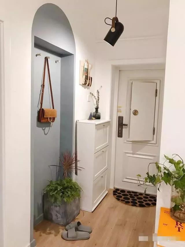 玄关处设计了一块入墙门洞,刷个拱门造型,简直想萌混过关,鞋柜上的杂志用两根皮带收纳,就是这么有创意~