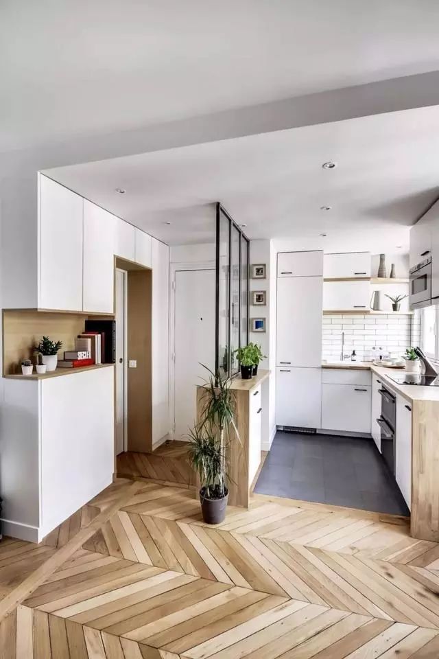 选了一款颜色素雅的波斯纹样砖,与木地板拼接,铝条收边,左侧白色玄关柜配搭