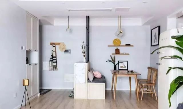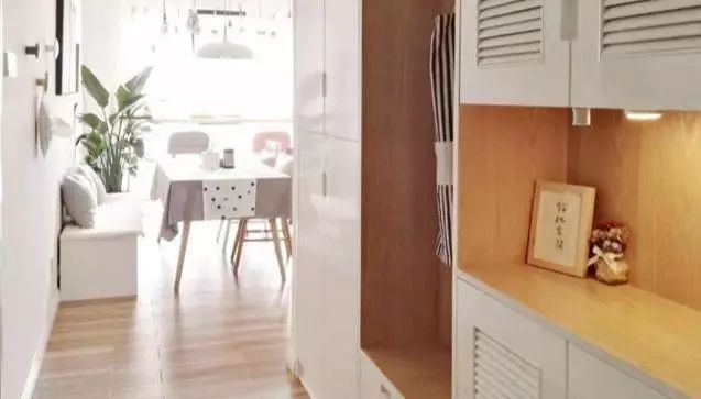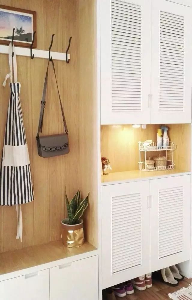 狭小玄关通常会采用超薄鞋柜节省面积,增加一条19cm同等柜深的长条木板,上面放摆件,底下设计挂钩位收纳单肩包,玄关功能既实用,空间也显得通透些。