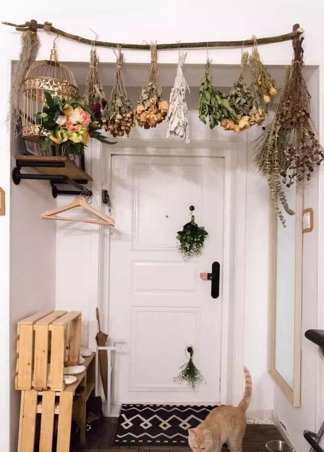 门把手皮扣装饰,木条框鞋架简简单单,干花「门帘」自然随性,细节之处充满日常质朴之美。