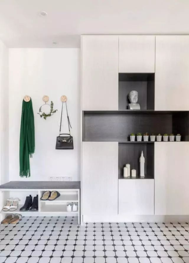 玄关柜黑白饰面,与地面方砖设计呼应,换鞋凳底部开放式搁板、卡座带插座,细节超走心。