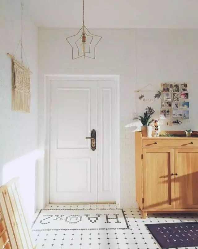这个玄关除了把毛坯墙的文化砖刷白,地面还定制了马赛克文字砖