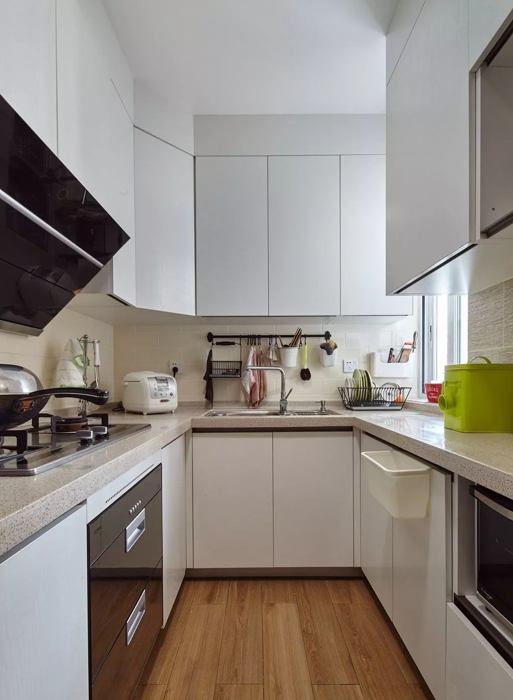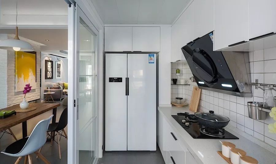 以白色为主色调的北欧风,可以延展人们的视线,减少小空间的局促感,加上镶嵌式的厨房改造工艺,可以把冰箱、烤箱等嵌入墙体,柜体,如此一来,即便是3平米,也可以井然有序,自如烹饪。
