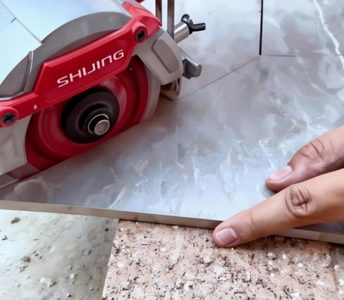 4. 切割过程:将瓷砖小心放入机器导轨,启动电动切割机,并缓慢推进。确保手指远离刀刃,保持稳定以获得平滑的切口。