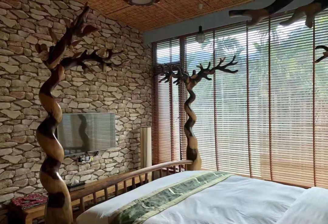 天然原木材料,将客房打造成原生态简约风格。这里的美,更多在于空间格局的流畅、视觉的柔和和随处可见的精致摆设,还有那多出的随性和舒适。