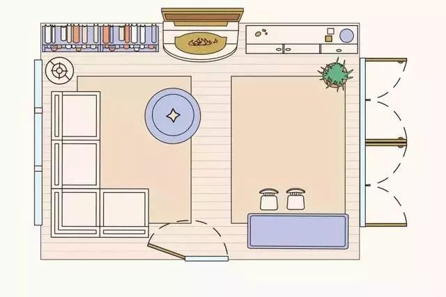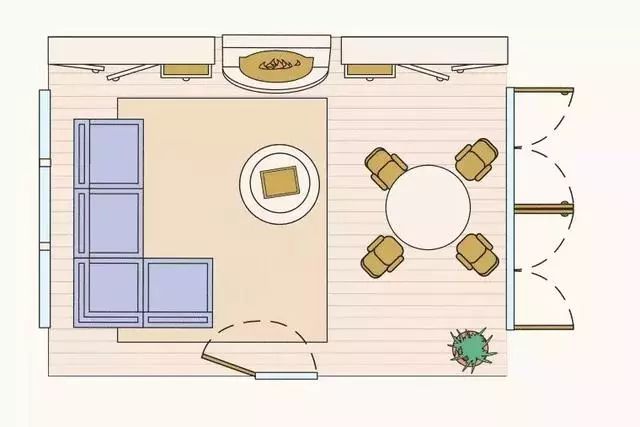 这种布局与上面的相似,但更加休闲和宽敞。窗户下方的一个部分,一扇门旁的桌子和一个可以从任何一个空间看到的中央电视。我只把地毯放在生活区域下面,但如果您不担心食物泄漏,这种情况与大型集中式地毯一样好。