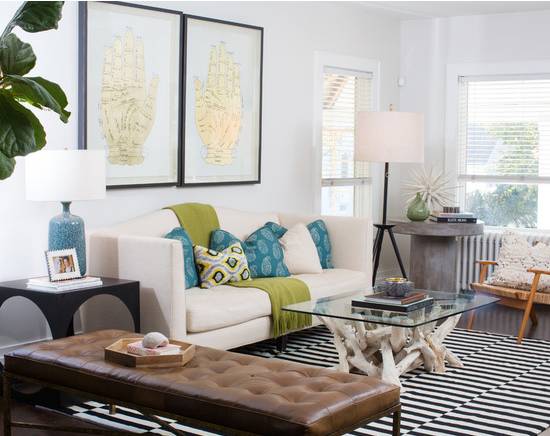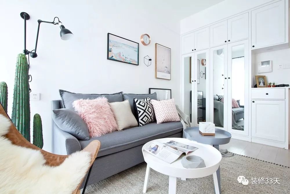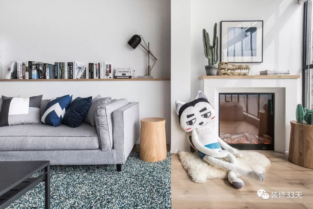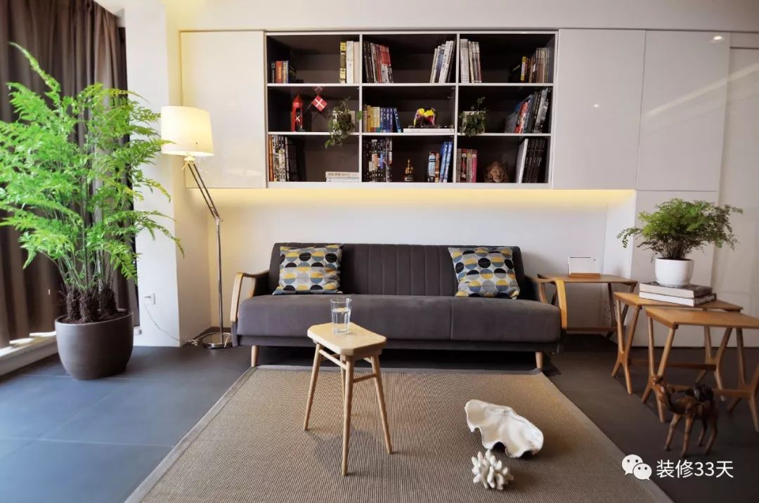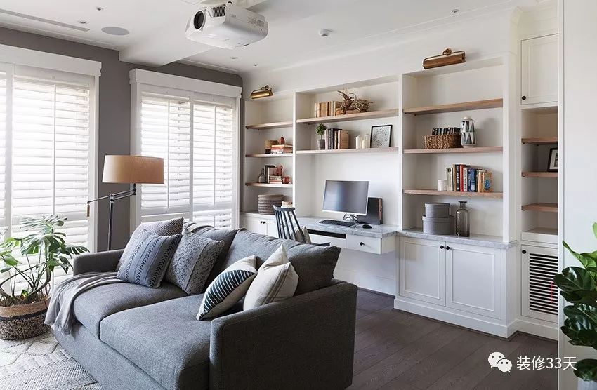 ▲ 在沙发后面的背景墙上设计一个吊柜,增加收纳的同时,还使整个大白墙看起来不再那么单调。