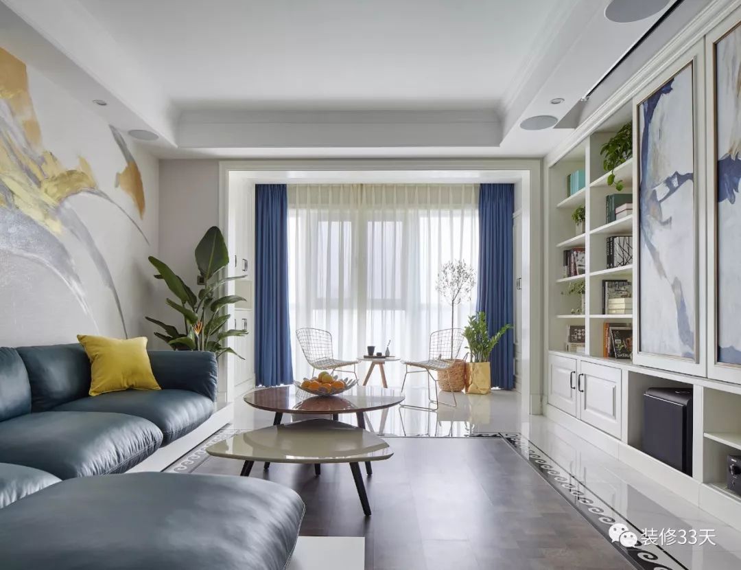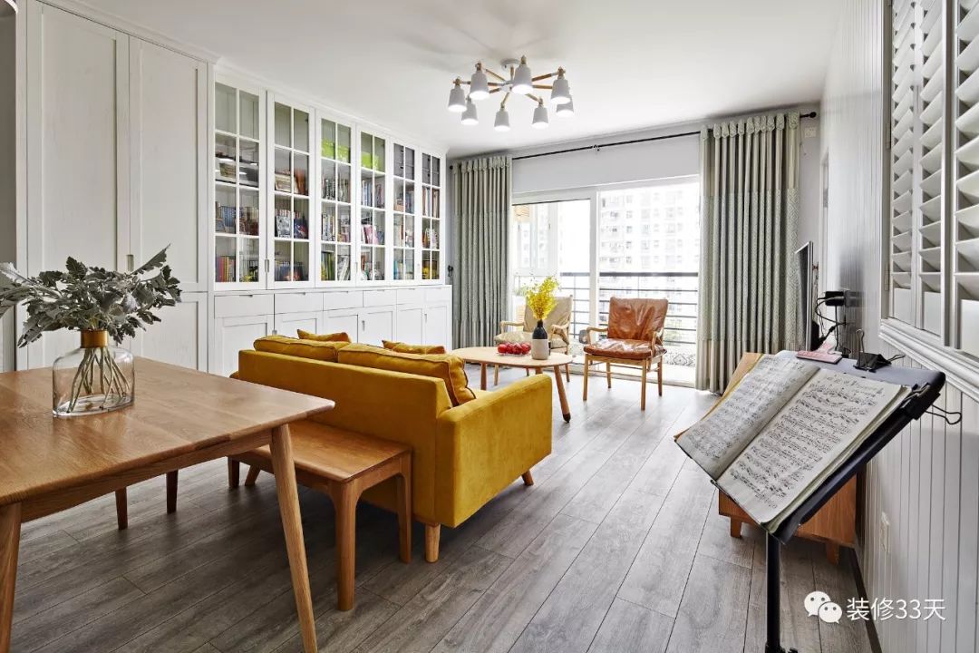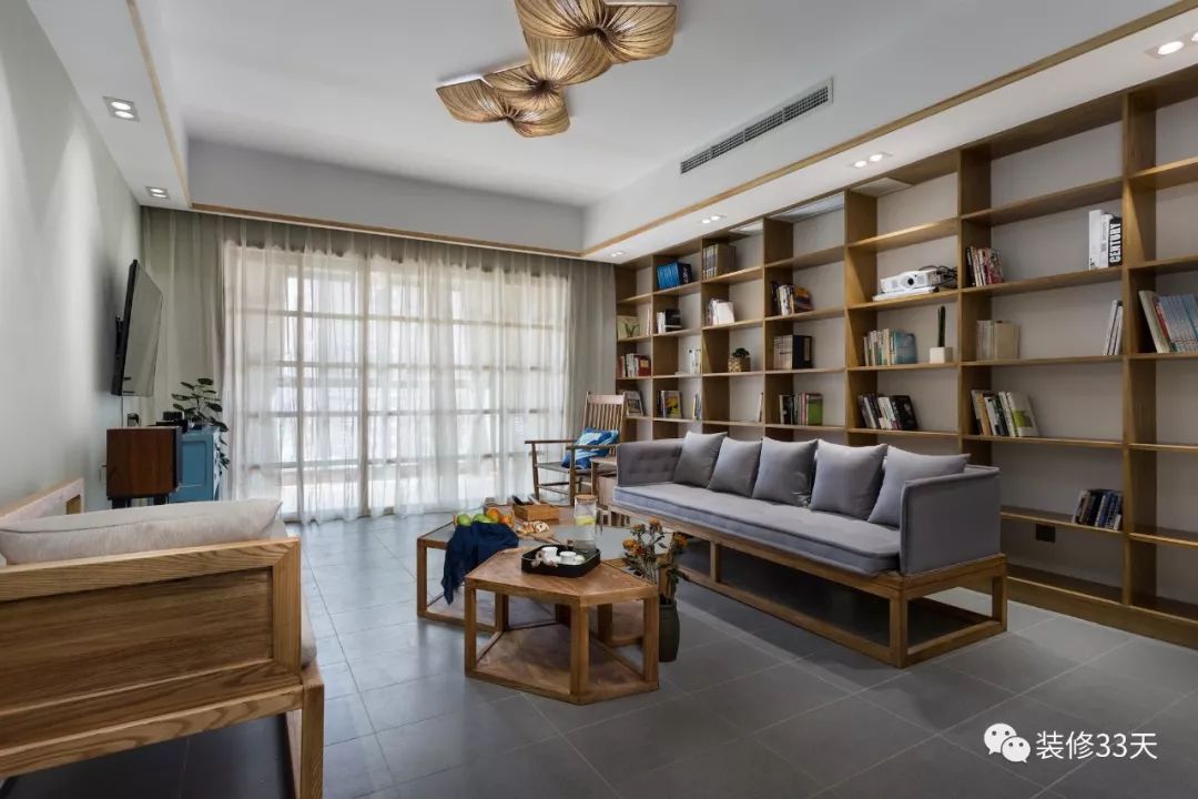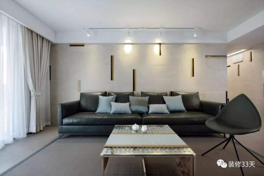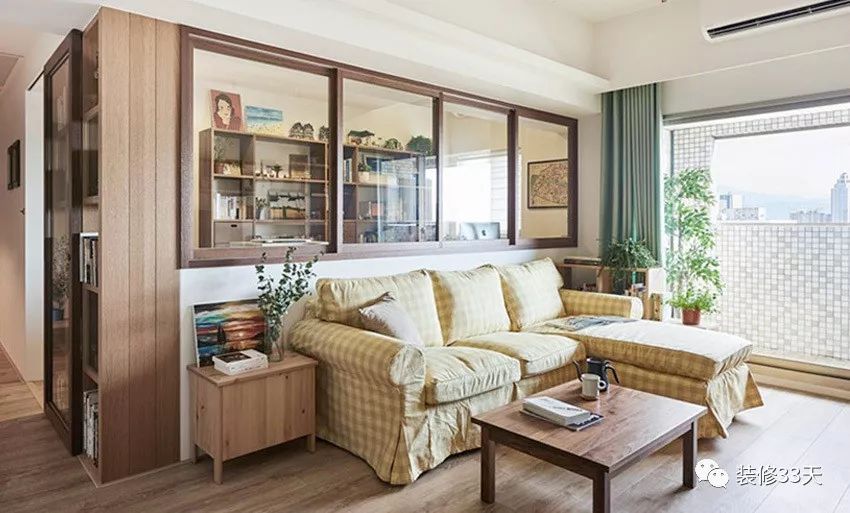 ▲ 沙发背景墙和书房之间做了玻璃窗,视觉通透,还起到了装饰的作用。