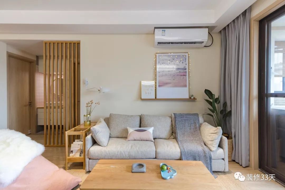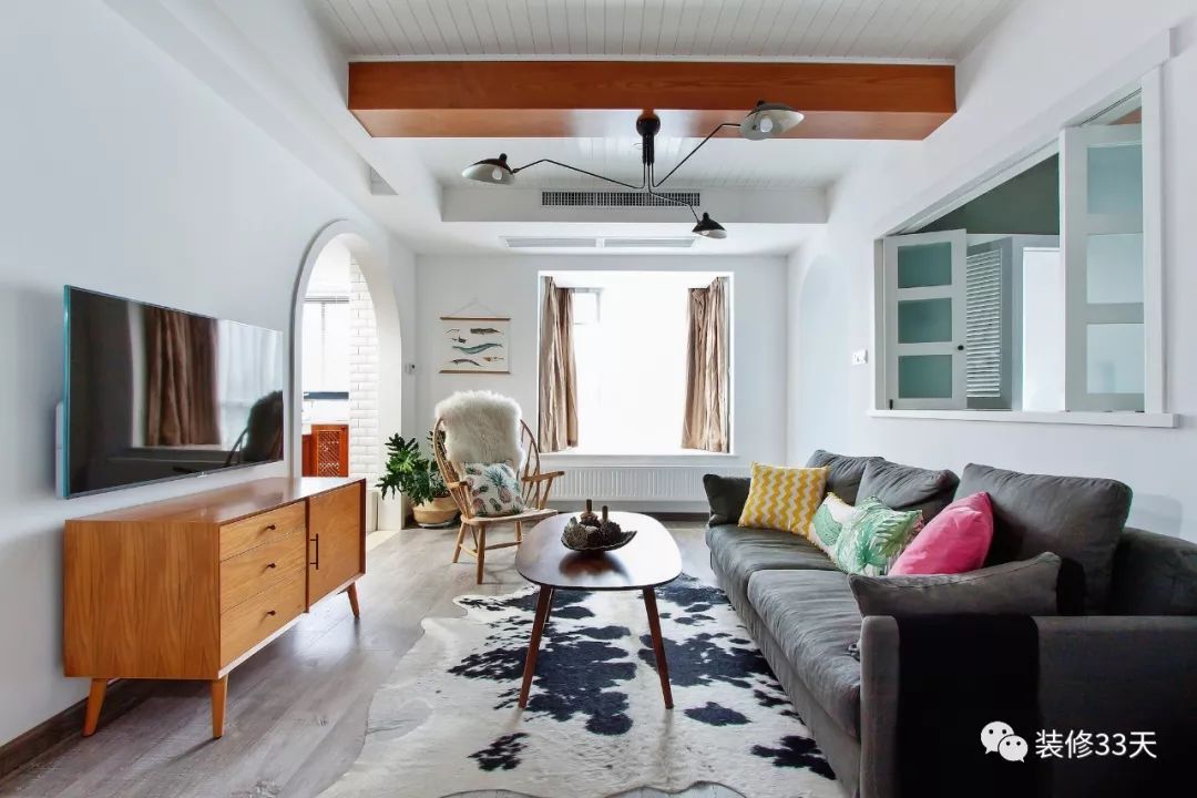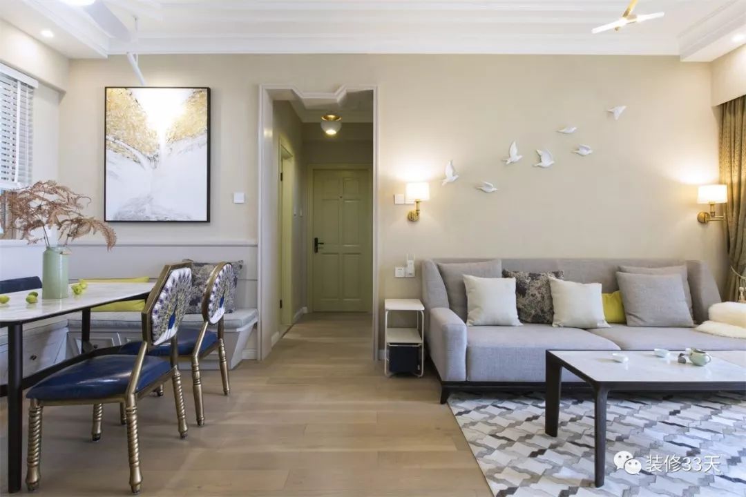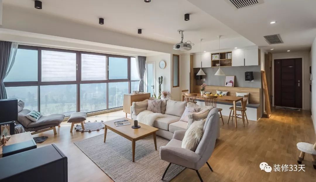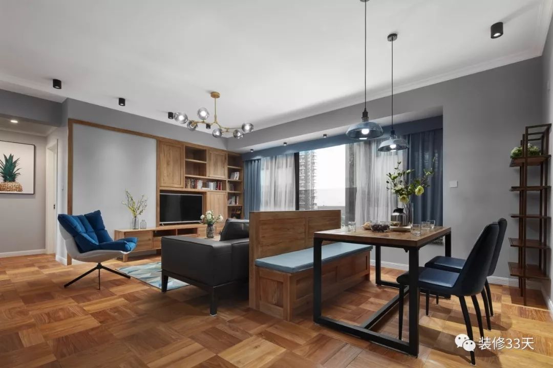 有些情况下,沙发后方隔着另一个功能区,也可以采用玻璃或窗户隔断进行互动,既保留了各自独立的空间,又不刻意打破两个区域的粘连。