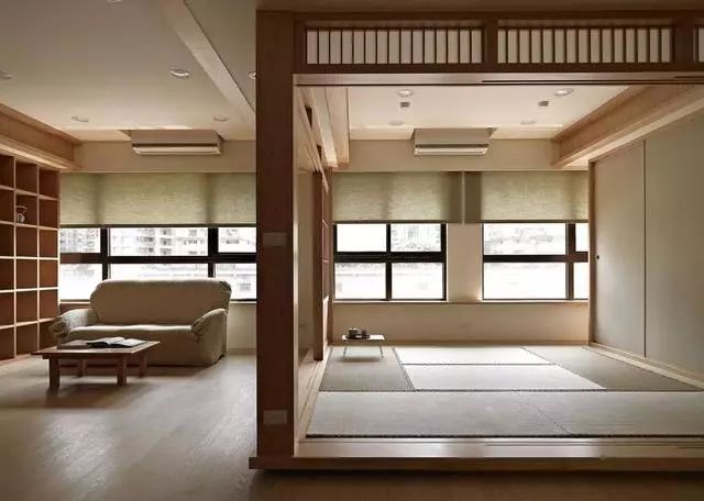 如何将全铺的空间,变为书房、客房、休闲房为一体的多功能房呢,书房部分,可房间左或右侧地面留出一个地面空间,在其上方的墙面固定好桌板,做成书桌形式,书桌上方的墙面也可铺排书架,这样便能在留出工作区域的同时也不破坏榻榻米的整体性。