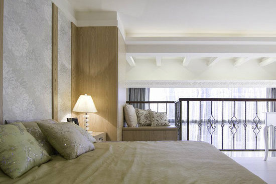 设计师用小圆弧的天花造型化解了床头压梁的风水问题。同时还让整个阁楼呈现出一种温馨的感觉。也让整个空间感变得多样起来。