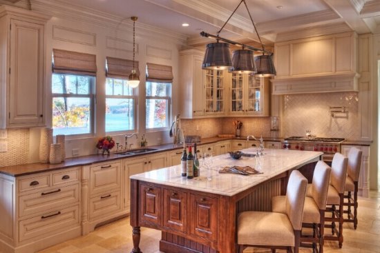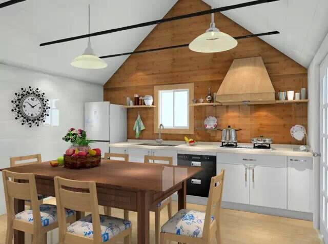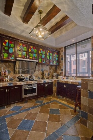 美式厨房生活的精髓就是随意、舒适,高大气派的风格,采用了不锈钢框的吊顶搭配,更是不乏时尚。