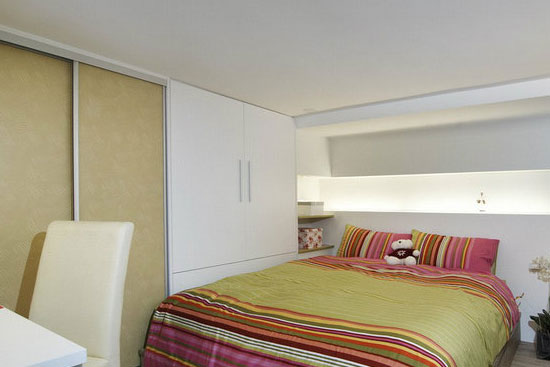 把阁楼作卧房,躺在床上看顶上斜面,感受独特。房间的凹位通过定制柜体、榻榻米得到充分的空间利用。