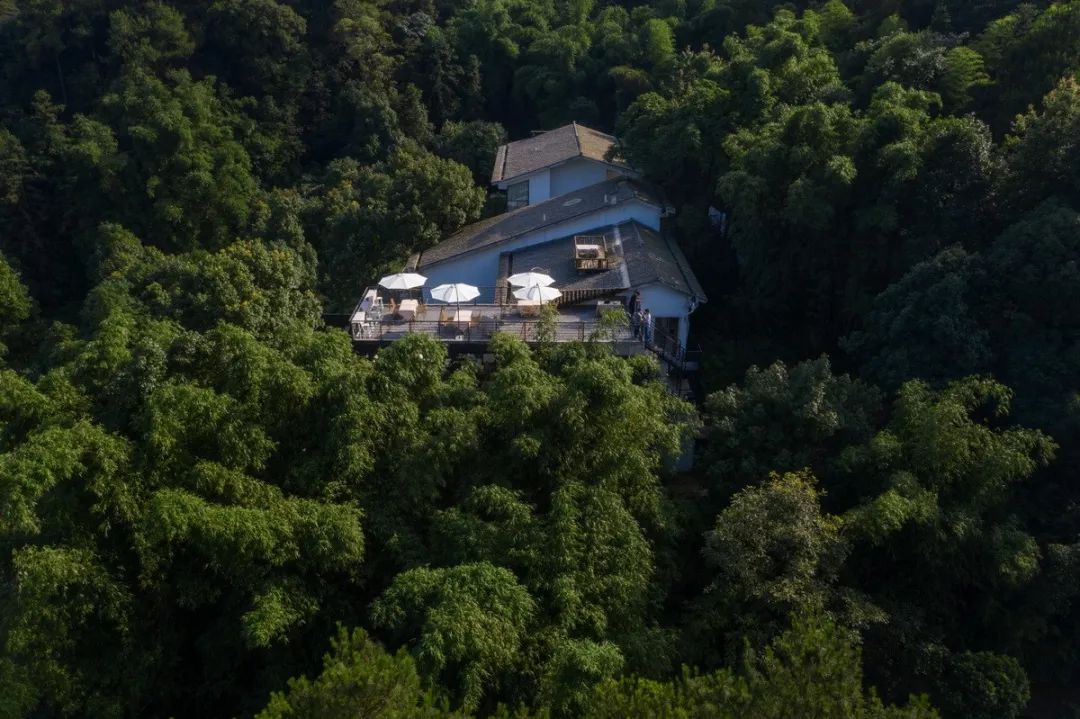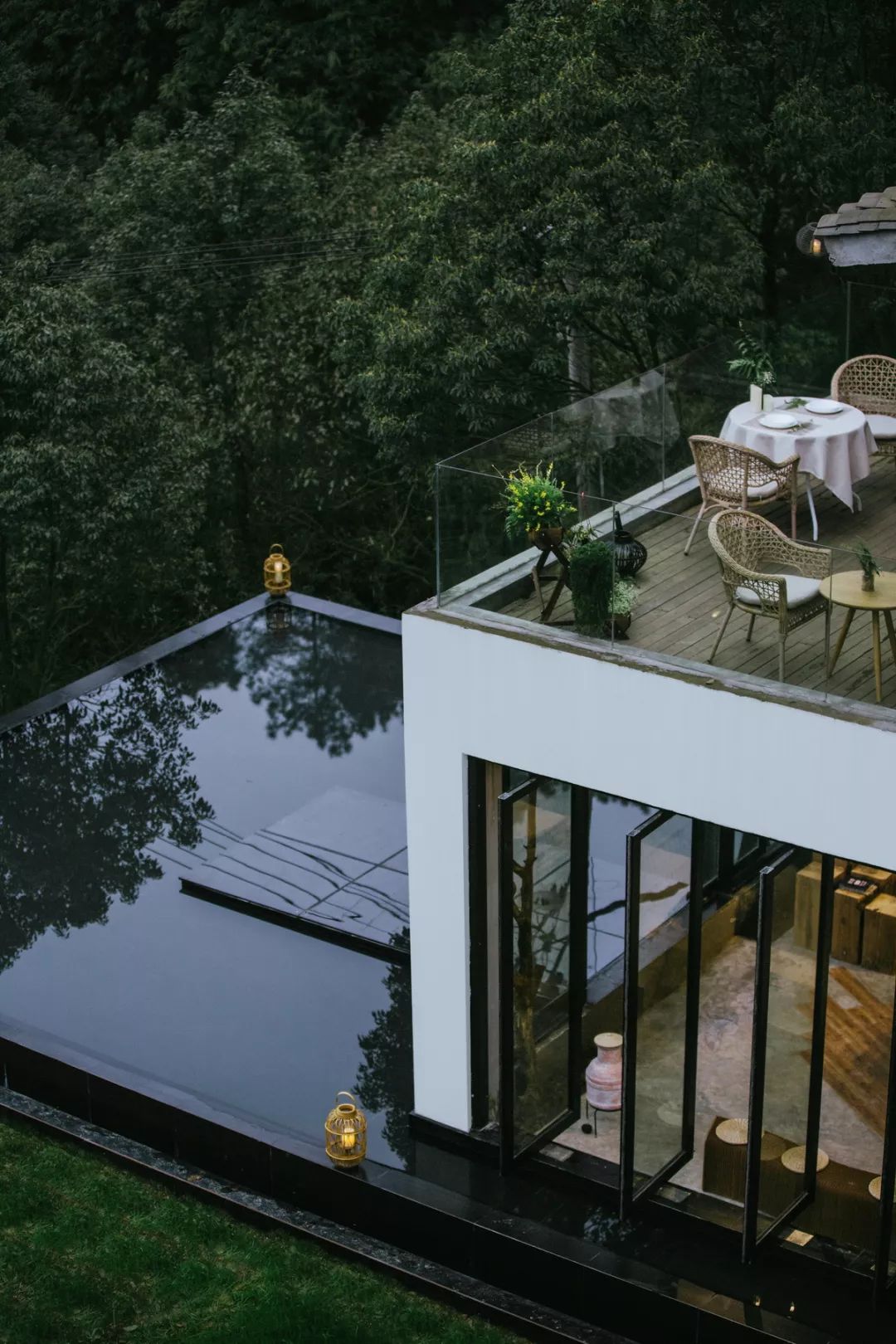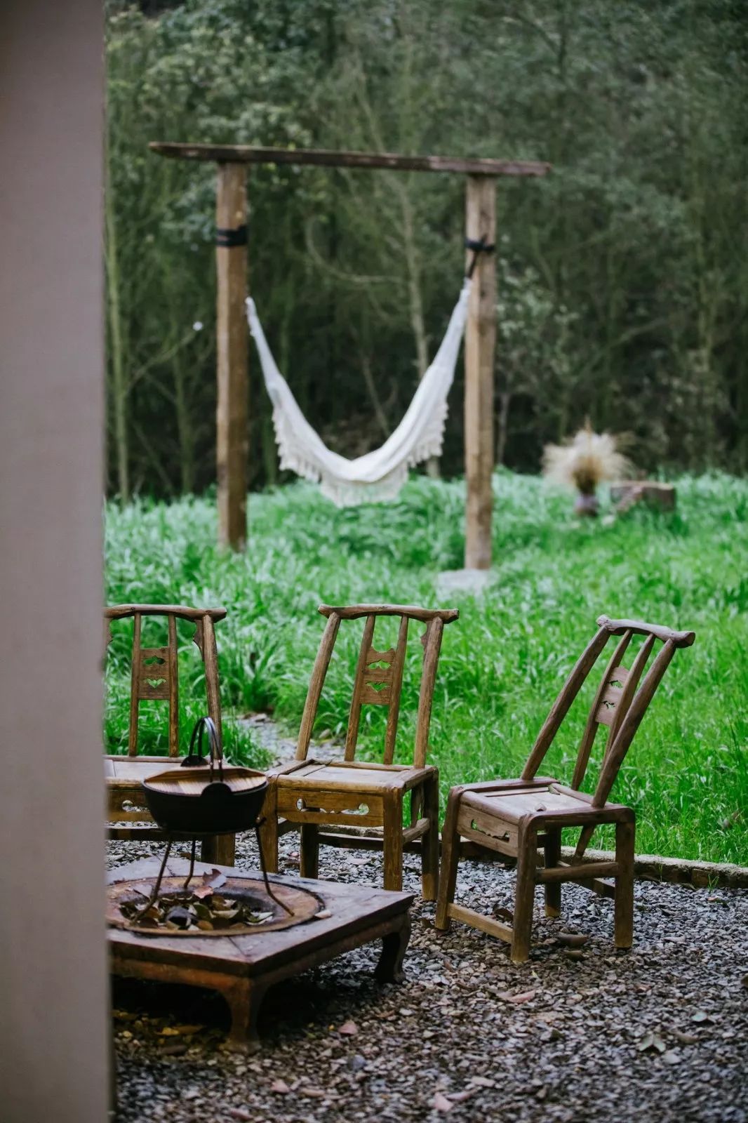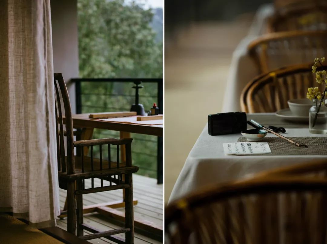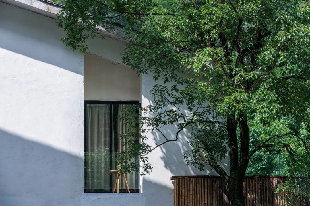 客房的风格上,也带着几分“野”的气息。虽然只有七间,但每间房依据不同的主题有不同的定位和装饰风格搭配,有些桌椅摆设甚至来自于业主在附近乡村“拾荒”所得,经过随性自然的布置,更添几分“野”味。房间均朝东,落地玻璃让透过山林的晨光肆意挥洒入屋,同时保证了良好的景观视野。室内的秋千,屋顶花园,可望到窗外虎峰山顶的泡池,树影斑驳白墙中的一米阳台……这些细微的设计赋予了每间客房独一无二的个性与风格,但又有一个共同点——拙朴素雅。