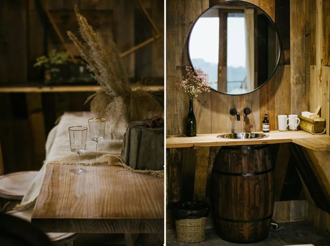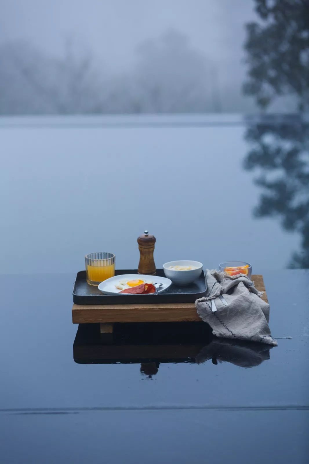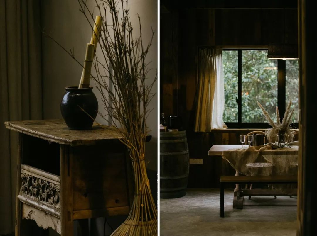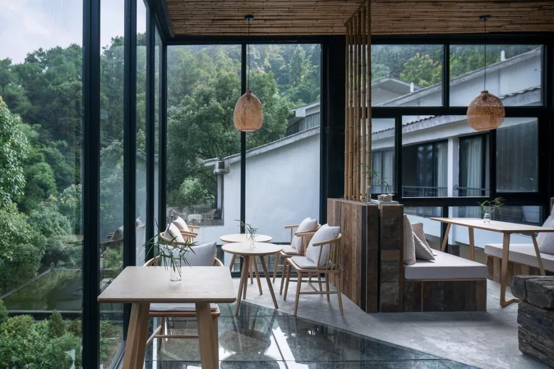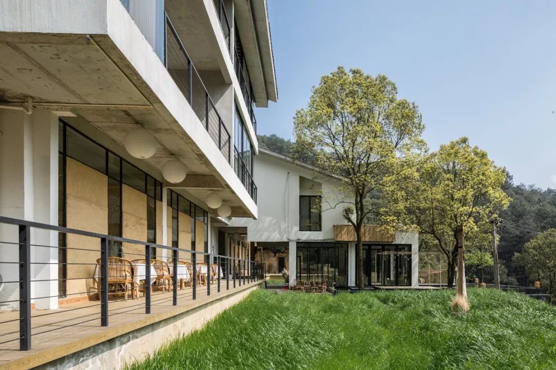 客房的风格上,也带着几分“野”的气息。虽然只有七间,但每间房依据不同的主题有不同的定位和装饰风格搭配,有些桌椅摆设甚至来自于业主在附近乡村“拾荒”所得,经过随性自然的布置,更添几分“野”味。房间均朝东,落地玻璃让透过山林的晨光肆意挥洒入屋,同时保证了良好的景观视野。室内的秋千,屋顶花园,可望到窗外虎峰山顶的泡池,树影斑驳白墙中的一米阳台……这些细微的设计赋予了每间客房独一无二的个性与风格,但又有一个共同点——拙朴素雅。