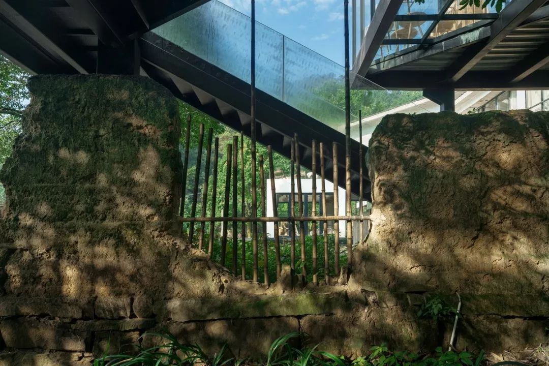 除了通过传承与保留来致敬历史外,更重要的是思考如何激活并使之得以新生。设计师通过与民宿主的协商,决定牺牲掉一部分的底层面积,从而保留下三合院沿步道一侧的夯土老墙。防水是保护土墙的关键,为遮蔽雨水以防侵蚀,架空在老夯土墙之上,新建了满足休闲茶饮同时视野开阔具备观景功能的侧翼体量,在材料上则主要采用极具现代感的钢结构和玻璃,与下方传统夯土质感形成强烈的对比。闲坐其中,抬头将山林云海一览无余,低头看得到老夯土墙的遗迹,演绎出一场现代与传统的对话。另外,非遗展厅、餐厅等底层公共空间的围合结构,大部分采用新工艺下改进的夯土形式,活化了乡土建造的传统,既是对老夯土墙的呼应,亦是为其注入了新的生命力。漫步于三合院之间,行走并不断深入建筑的过程中,从入口的老夯土墙,到主体建筑的素混凝土,再到角落出挑的钢结构楼梯,无不隐藏着建造材料从传统向现代、从旧到新逐渐过渡的巧妙逻辑,能够感受到设计师对这片场地新旧关系的回应与阐释,这片夯土老房在此刻仿佛得到了“重生”。