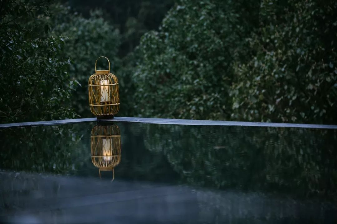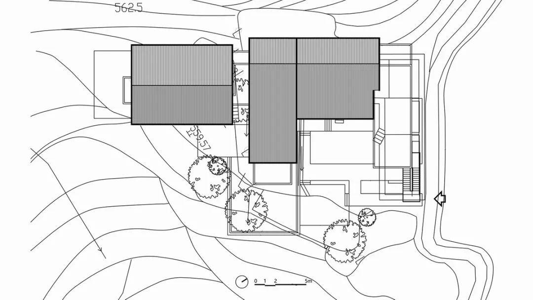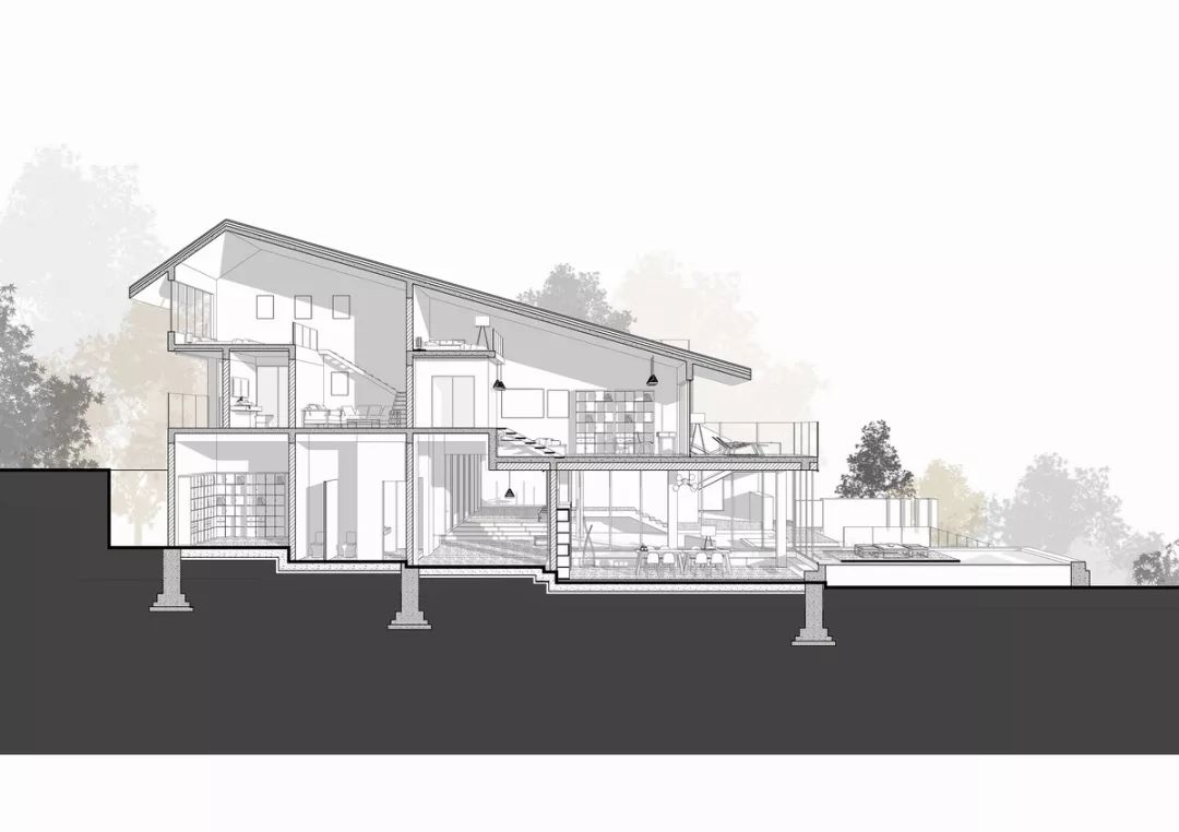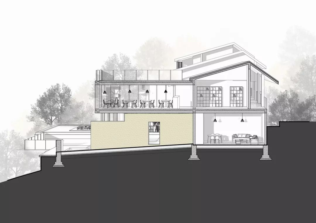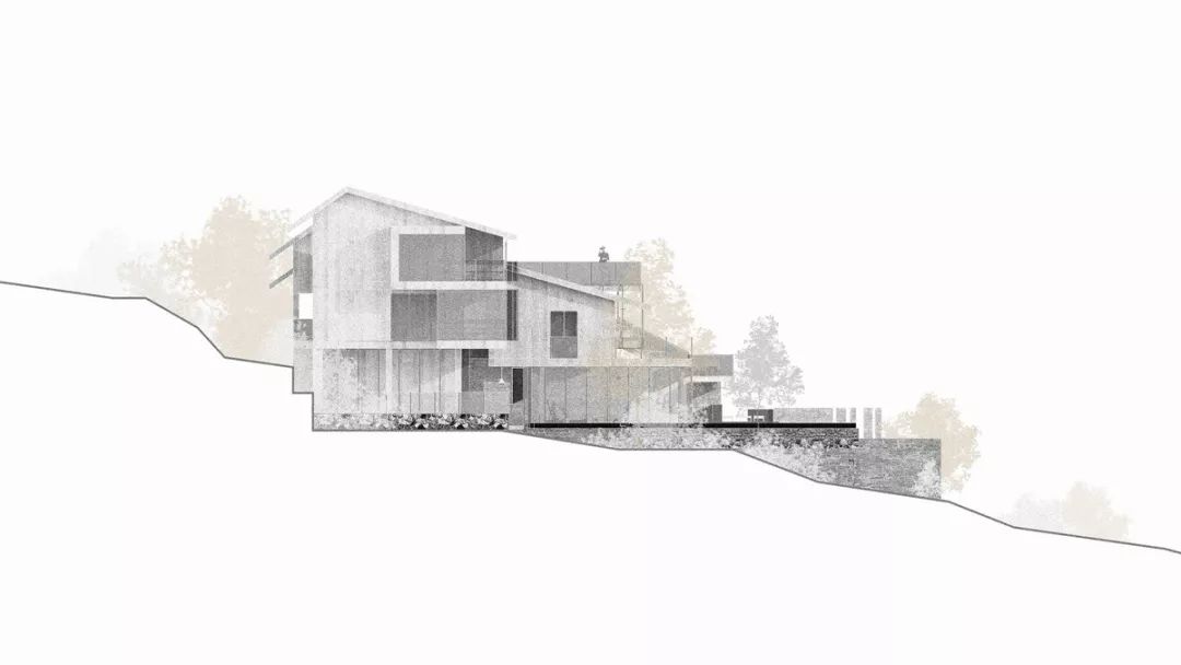 民宿主对纯粹的山居生活充满着憧憬与执着,并希望为久在城市喧嚣中的人们提供一方与浮躁过去和解、重回大地山林环抱的平和之地,设计师则起于对场地自然现状的尊重,根据自然造形赋势,将“山”“隐”二字化作建筑的灵魂。通过前期的现场勘测,定位了场地内所有的大树,不仅全部被保留,甚至为了树的位置几次调整建筑或景观的布局。另外,一系列的景观露台,长短坡屋顶依据山势走向、景观、视野的不同而进行高度与进退关系的调整,给予不同层次不同的视觉体验,实现最大化的景观利用。或攀上最高的露台,远眺虎峰大地,林海茫茫,雾气朦胧,一方碧水半隐半现其中;或闲坐无边水池旁,端详水中倒影,香樟为邻,春风拂面,几片陨叶悠然下落。场地原生的自然与景观的需求通过设计巧妙的达到了平衡。