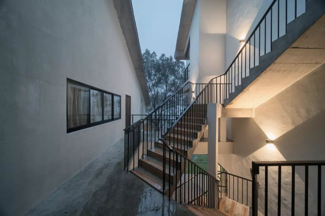 古有周权撰《野趣》,今亦不乏热衷自然的原始质朴之人。寺下山隐中,从景观到工艺的处理,处处散发着这样的情趣。入口廊道地面使用了施工余下的竹竿,嵌入泥土之中,穿插其中铺满碎石子,随性又不加雕琢。走进三合院内,没有人为设计过的景观痕迹,自然生长的野草毫无荒凉之意,反倒增添了盎然生机。整个院子,自东南向西北,通过建筑的布置与层高的变化形成层层叠叠,虚实相间的视线关系,三合院内驻足片刻,穿过乡间书屋旁的廊道,才见一栋三层的建筑与一旁优雅的庭院与草坪,颇有发现了世外桃源的惊喜。“野”的趣味渗入空间每个角落,诉说着大巧若拙,由自然而生的无设计美感。