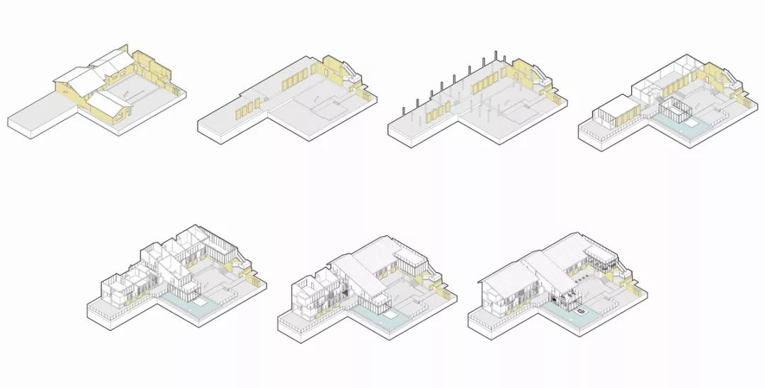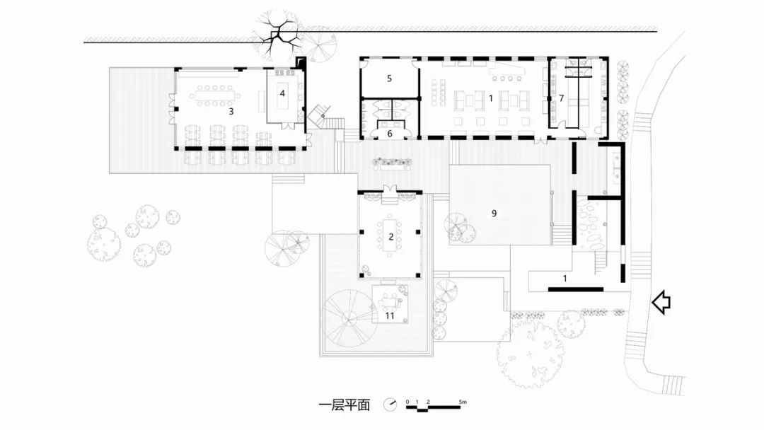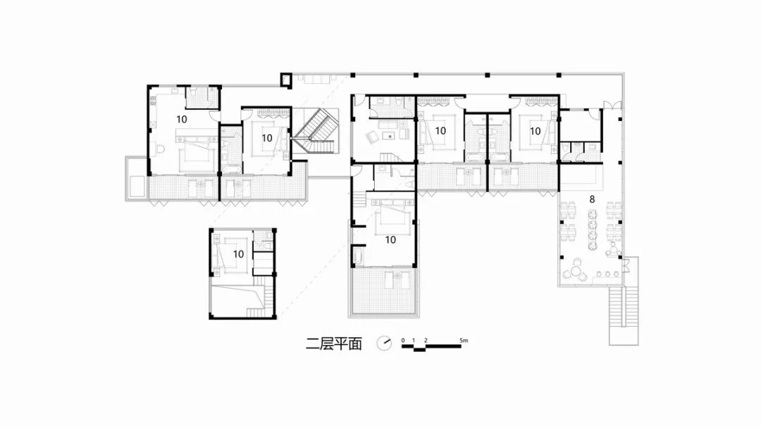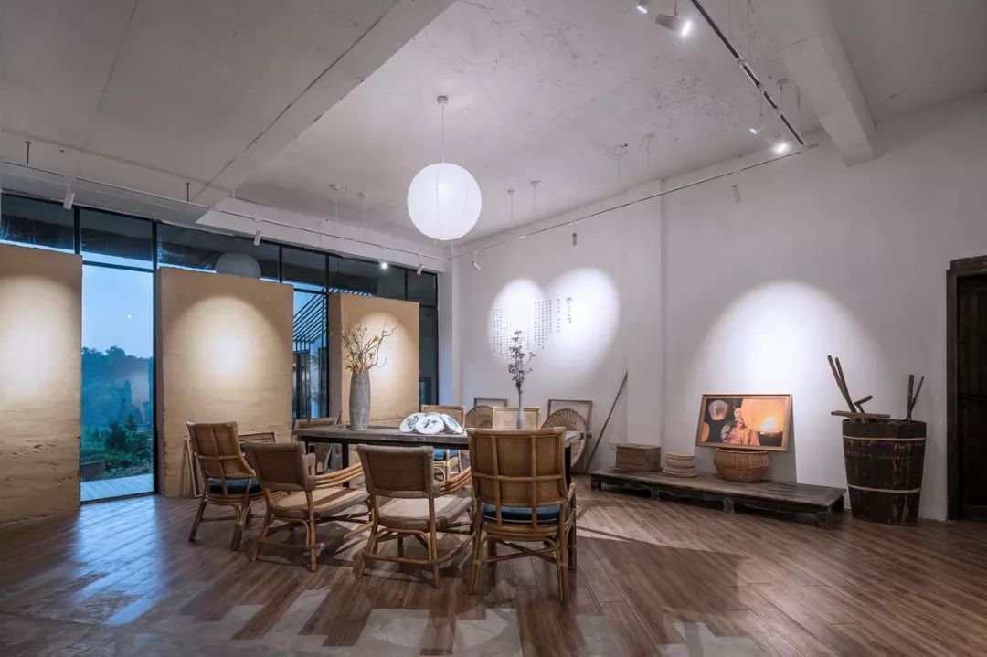 民宿的建筑面积约800平方米,但出于公益性与开放性的目的,民宿中仅在建筑的二、三层设置了七间客房与一间主人房,其余面积均用作公共空间:入口处的游客接待驿站、底层的非遗展厅(接待厅)与无边水池旁的乡间书屋。这一功能组织上的考虑,既创新了民宿的功能组合模式,又赋予了其独特的社会价值和人文关怀,使之成为来往游人在步道途中难忘的记忆点。
