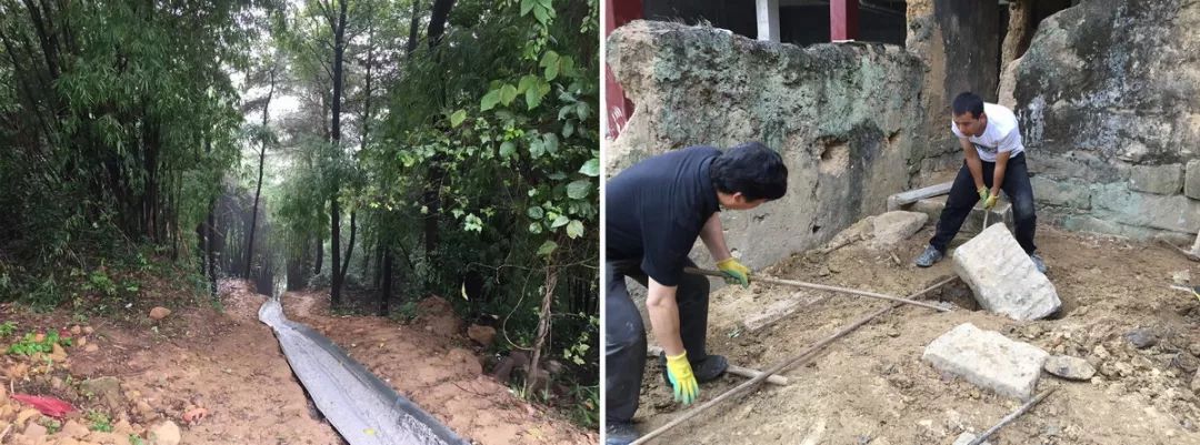 乡土建造自然饱含着民间的智慧。在不通公路的条件下,复杂的地形条件使建筑材料的输送受到了很大的限制,为解决土建材料的搬运问题,经过实地踏勘、反复选点和商议,施工队在虎峰寺遗址下公路边的一处方便卸货的场地旁,用镀锌铁皮敲打出一个滑槽,连接公路与靠近场地稍微平缓的地方,再通过一条可以用手推车运输的便道将建材运至工地。然而在后期装修中,如玻璃、家具、洁具等易损物件,还是只能依靠肩扛手抬的最原始的方式。建造的艰辛始终贯穿着项目修建的整个过程,但面对不同时期的不同困难,民宿主、设计师和施工队总能积极应对,虽然施工周期持续近两年,但完工的那一刻,各自的满足与欣慰又是普通项目所无法比拟的。