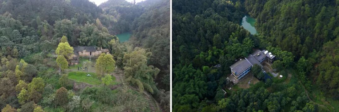 项目坐落在重庆市沙坪坝区曾家镇虎峰山村,傍百年步道而建,隐于林海之中。沿步道拾级而上,又可见始建于北宋乾德年间虎峰寺(川主庙)遗址埋没在山顶的荒草丛中,只剩几座百年残佛记录岁月起落更迭,故将项目名为“寺下山隐”。随着这些年虎峰山村所处的重庆大学城的逐步发展,为距离大学城核心区仅20余分钟车程的虎峰山增添了浓郁的艺术气息。来自川美、重师、重庆大学等高校的艺术家纷纷“落户”虎峰村,开设了工作室、画廊、美术馆民宿和茶舍。