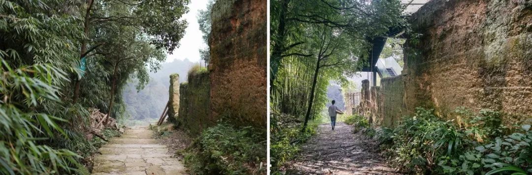 建筑的更新与介入带来了新旧关系的思考与重塑。民宿的基址,是一座残破废弃的夯土老房围合而成的三合院。为了传承这西南地区特有的山地乡村的文脉与肌理,新建的建筑也通过控制体量的尺度与围合还原了基址过去的院落空间。另一处的处理也表达出了对原有场地的尊重:场地所处的标高与上部的公路,垂直海拔相差约五十米,但无论设计师和民宿主均坚持不去修通公路,仅靠一条一米多宽的陡峭石板步道作为交通连接。游人们踏着青石板,伴着清风拂过竹林的声响,路过一湖碧水后望见路边那片拙朴的夯土老墙,便晓得了寺下山隐就在眼前。如同经历了一场自然的精神洗礼,使抵达的过程充满了仪式感。