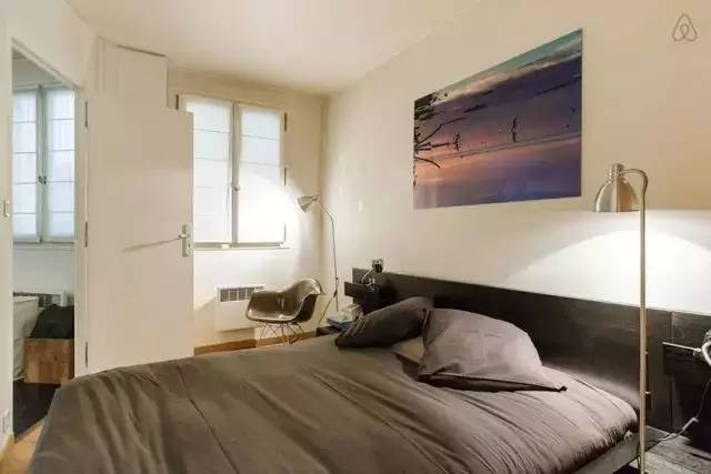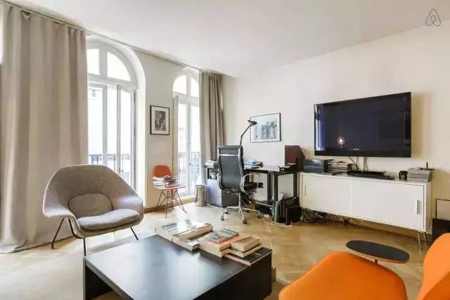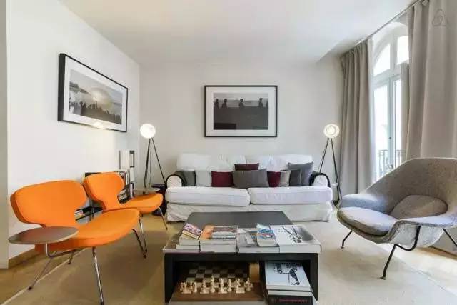 房间布置简约,但设计感很强。浅色系的房间里,搭配橘黄色的椅子,很鲜明,让房间色调不会太单一。且椅子边托盘的设计使用起来很方便。