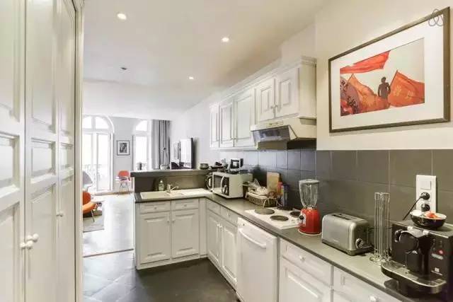 长条形厨房可以有序的摆放厨具用品,不会太杂乱。白色橱柜风格统一。
