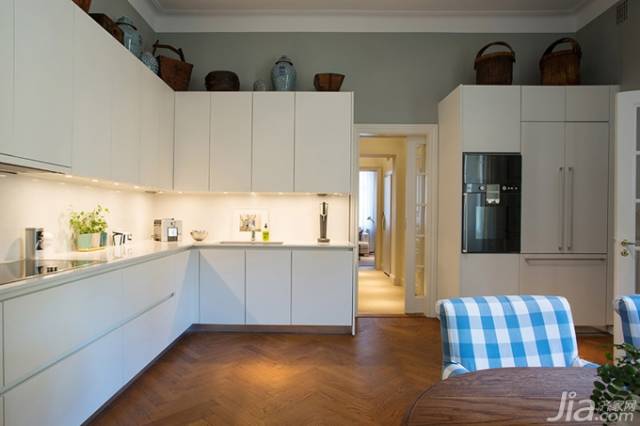 清新纯白的北欧风开放式厨房,亮点是纯洁无暇的白色整体橱柜和嵌入式大冰箱。