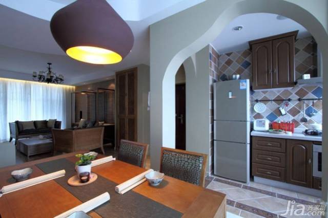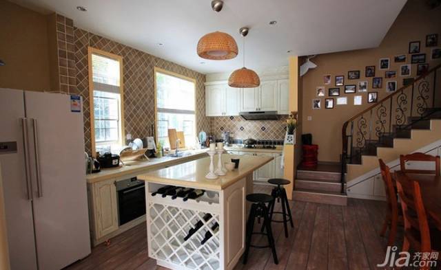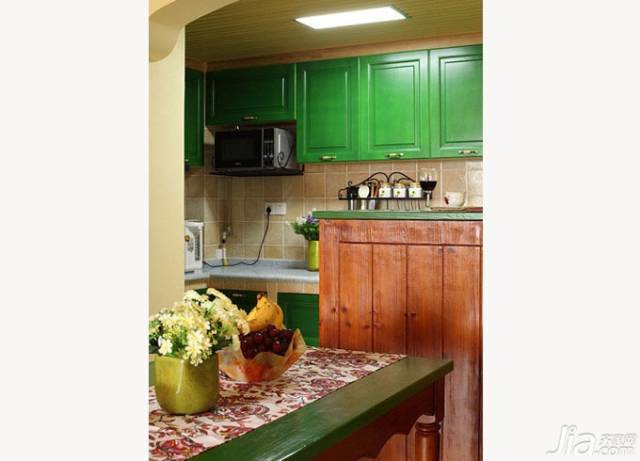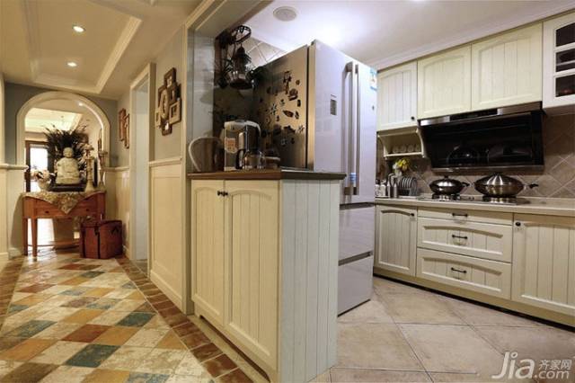 奶油色的美式风格厨房门口是一条复古做旧的五彩过道,过道的尽头则摆着东南亚风格的装饰柜,各种风格混搭在一起摩擦出了多彩的火花。
