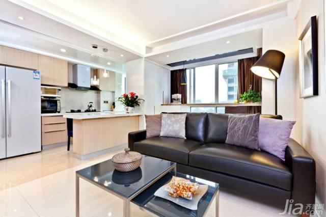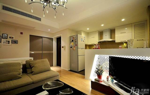 由于格局上的局限,显得客厅十分拥挤,幸亏厨房采用了开放式的设计,以及客厅选用了米色含金丝的浅色墙纸,很大程度的改良了空间紧凑的问题。