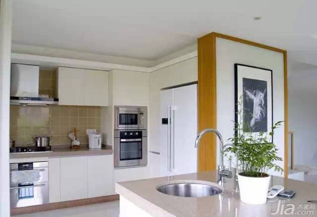 厨房是开放式的,还有个不大不小的中岛吧台,原木与绿植撑托着白色系的厨房,洋溢着清新。