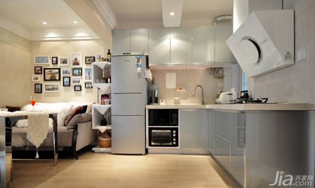 与其他人家不同的是,这个开放式的厨房隐藏在了电视背景墙的后面,低调又委婉,温馨又不夺风头。